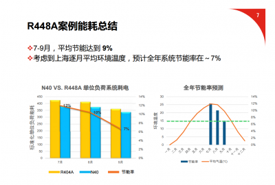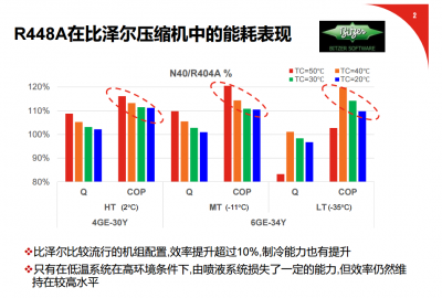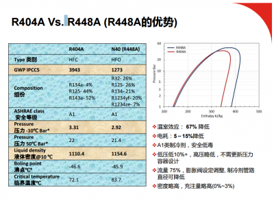 R-448A在商超制冷系統(tǒng)中比R-404具有優(yōu)勢,低耗能,環(huán)保。溫室效應比R404A降低67%,電耗降低5-15%,低壓低10%+,高壓略低,不需更新壓力容器設計、流量 75%,膨脹閥設定調(diào)整, 制冷劑管路 直徑可降低,密度略高,充注量略高(0%~3%)。