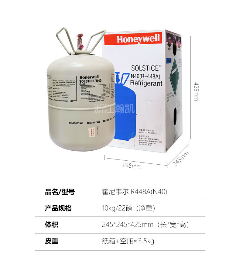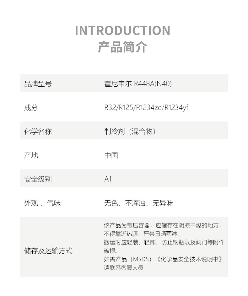 霍尼韋爾R448A制冷劑,商品名稱Solstice N40,R448A屬于ASHRAE 34 A1級(不可燃)制冷劑,不會消耗臭氧。Solstice N40(R448-A)GWP值僅為1273(IPCC,AR4),比R-404A(GWP值為3920)低65%,是R-404A和R-22的低GWP值替代品,可提升系統(tǒng)能效。
